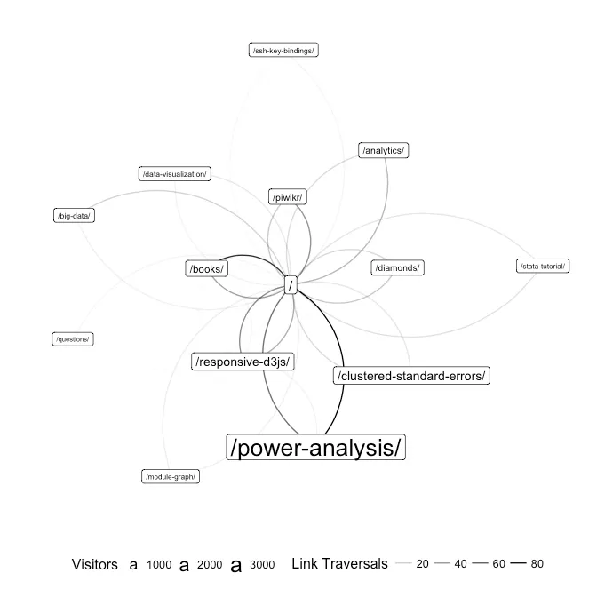 piwikr can also visualize how users navigate from page to page on the site. Each node in the graph below represents a page on the site, the size of a node is proportional to the number of visitors who have viewed the page. The width of each edge is proportional to the number of visitors that traveled between the two pages.
