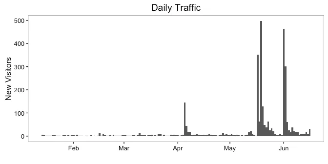 piwikr also comes with functions for creating graphs. How much traffic has the site generated over time?